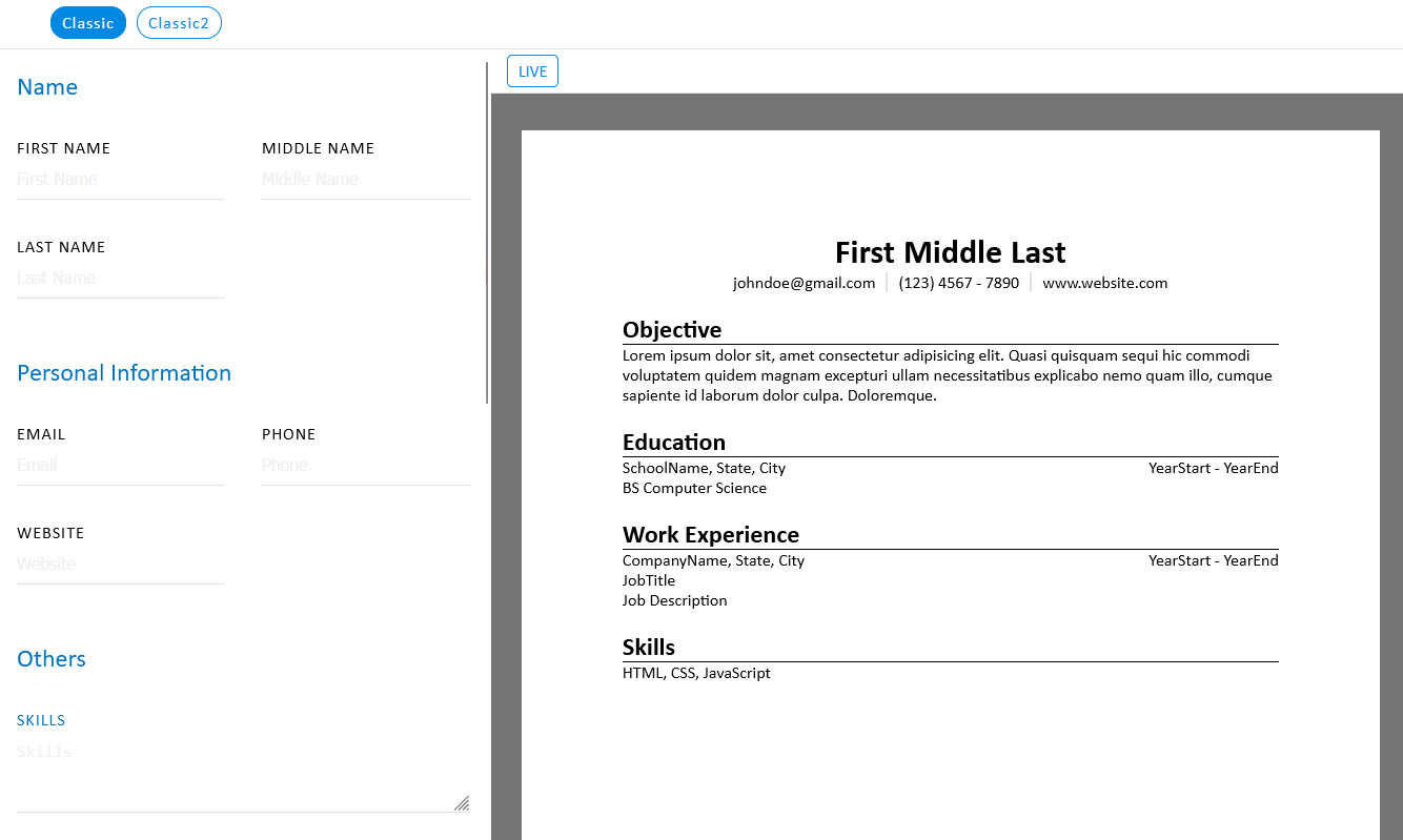 Responsive resume generator based on templates so you don't have to worry about styling your resume. Fill out the information and see changes live as you type. Switch between templates of your choosing. Built in 2021 as an introduction to React.